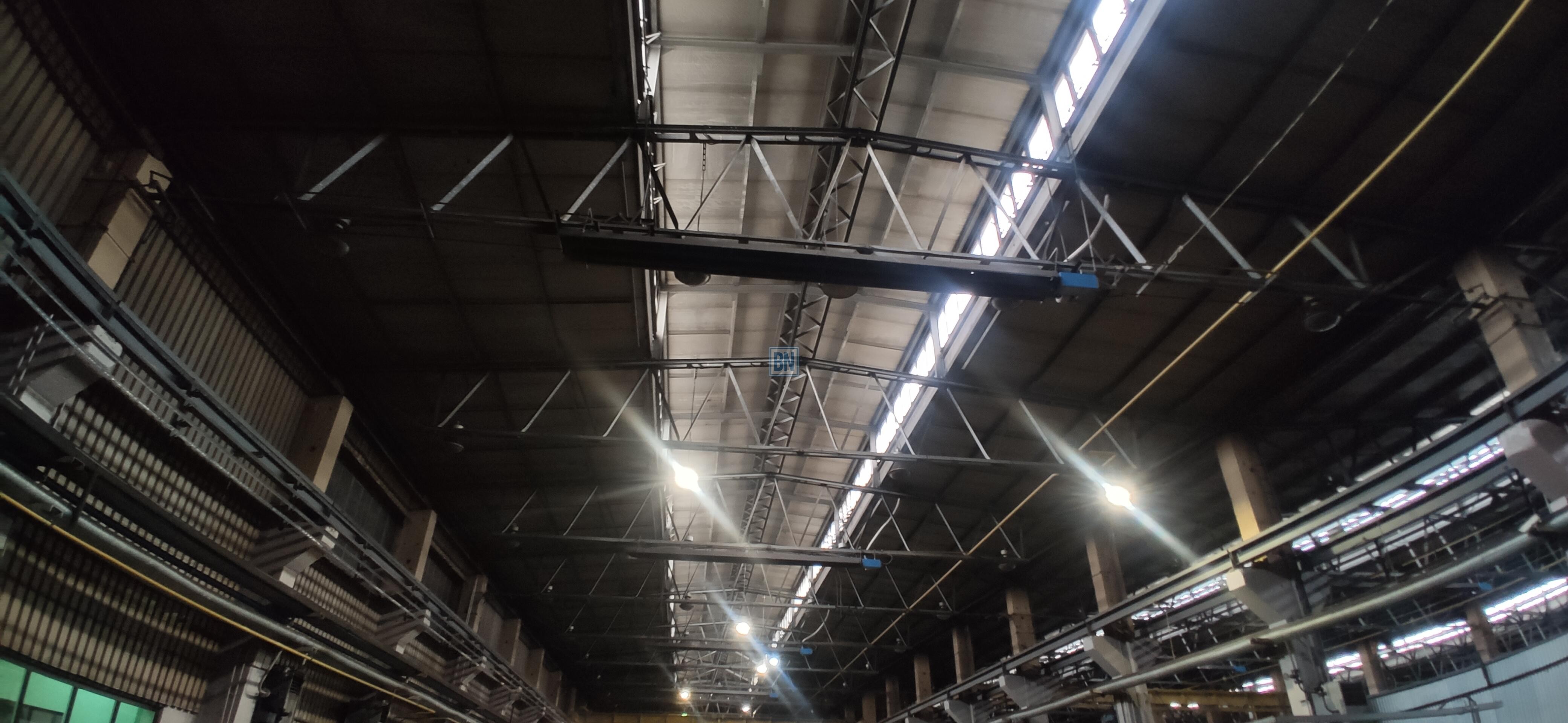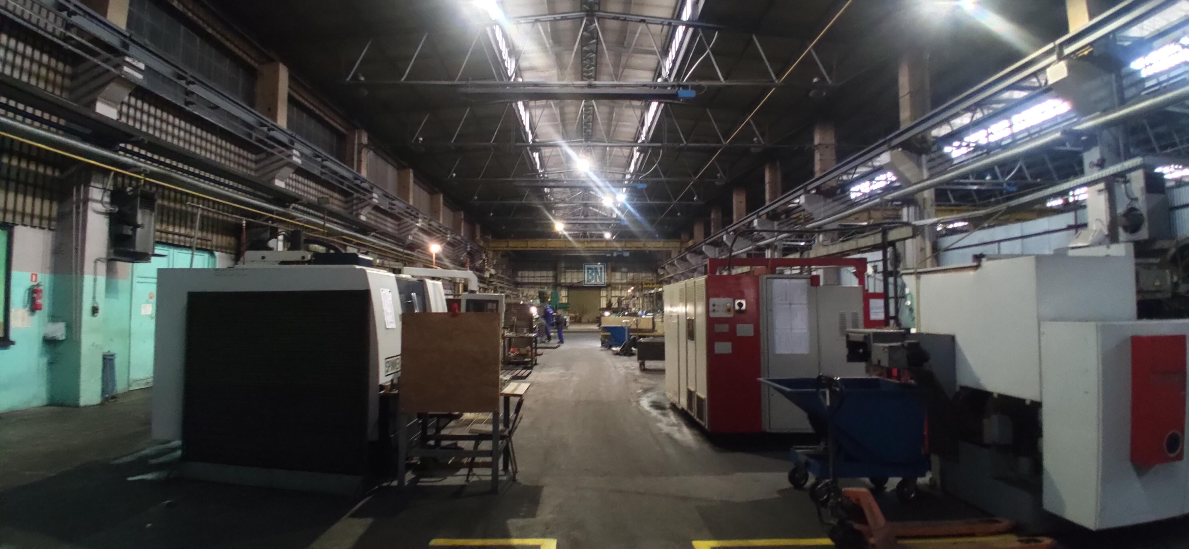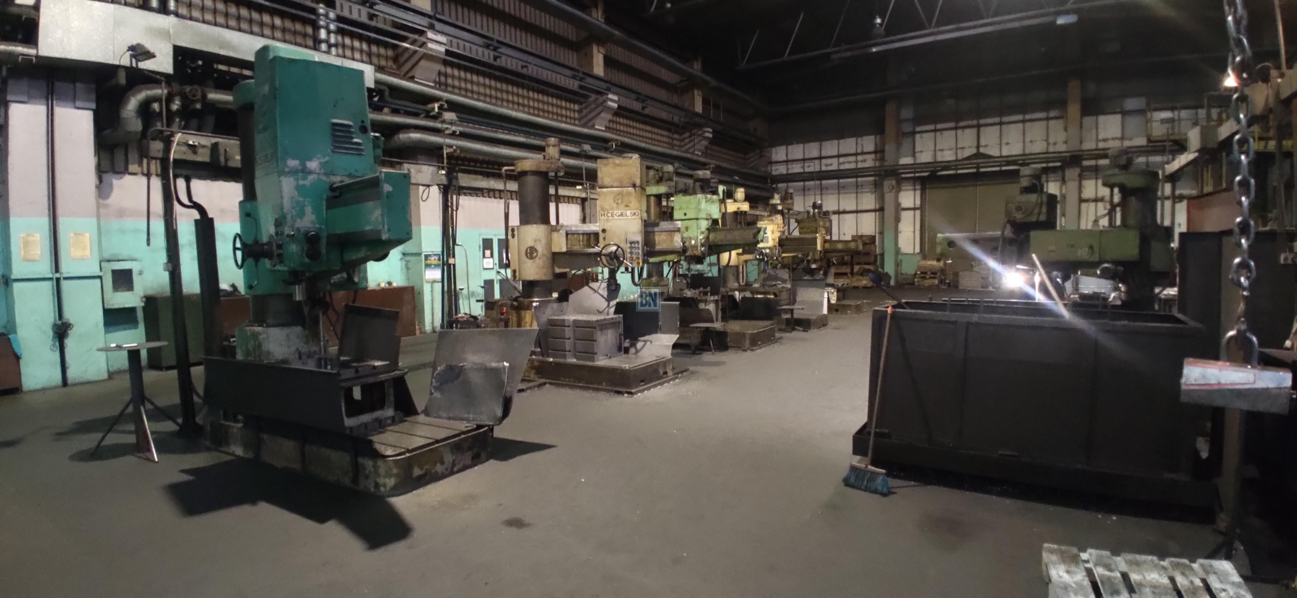 3 suwnice 3,5 t (w każdej nawie jedna). Słupy umożliwiają montaż suwnic ok 15 t.