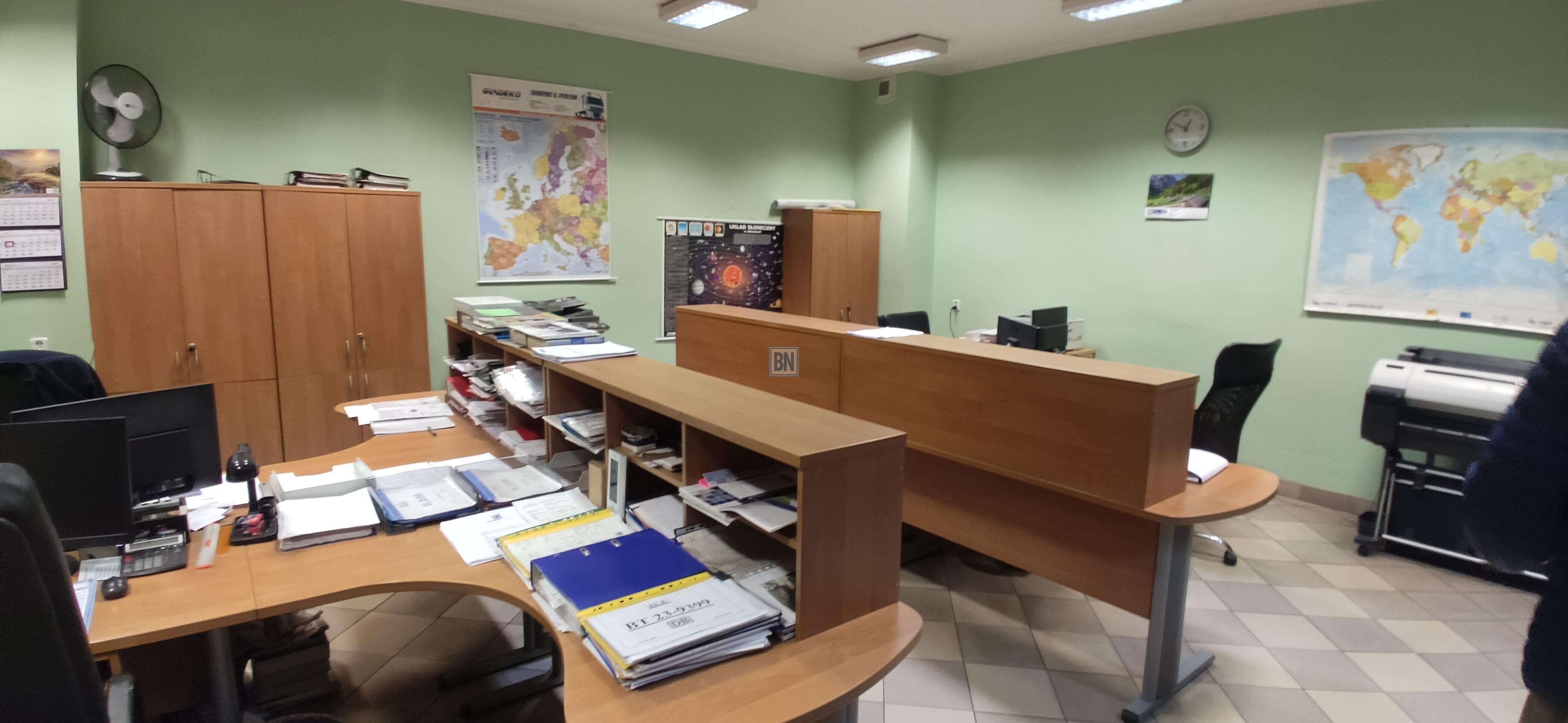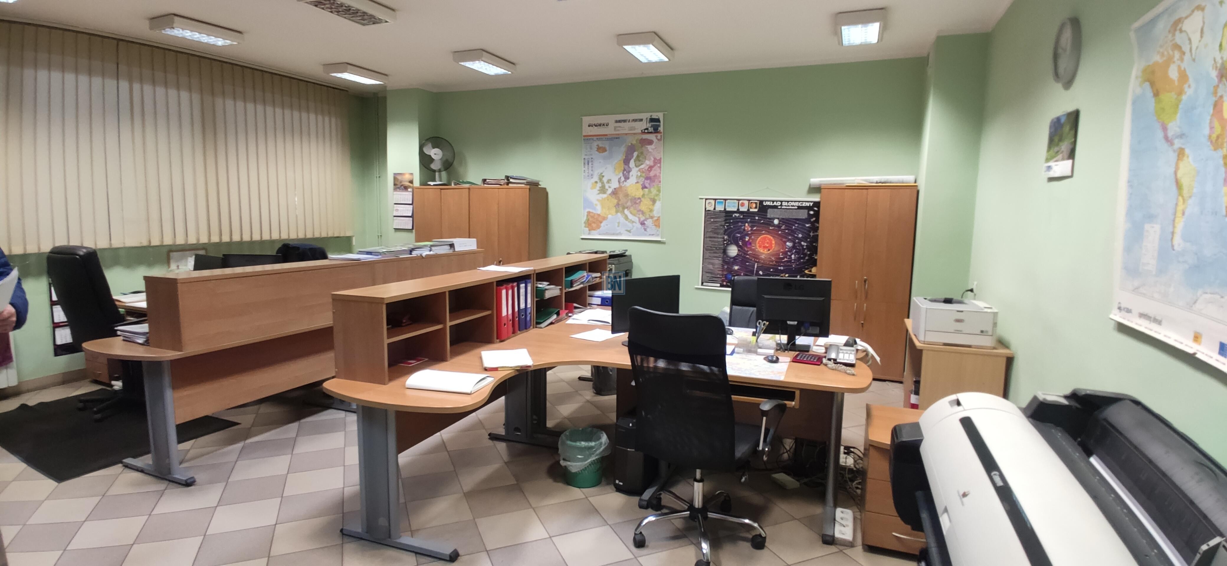 Na parterze: gabinety, sekretariat, sala posiedzeń, biura pionu technicznego i administracyjnego, zaplecze socjalne, WC, korytarz, warsztaty, narzędziownia, kotłownia gazowa i skład opału.